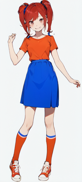 maria is an teenager girl with medium, shoulder-length red hair that is tied into pigtails with orange hair ribbons, her eyes are turquoise blue and wears a orange shirt that has a red heart print, blue skirt and some pair of knee-length orange socks that has a pair of red sneakers.