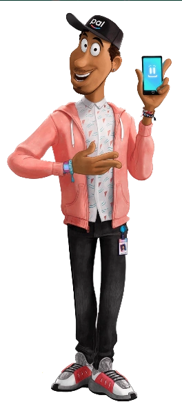 Mark has dark skin, short, black, curly hair and an anchor beard. He appears with a black PAL cap, a pink jacket, a white collar shirt with teal and pink triangles, four Pal Labs-themed bracelets, black jeans with his ID clipped on one pocket, and grey, red, black, and white sneakers.