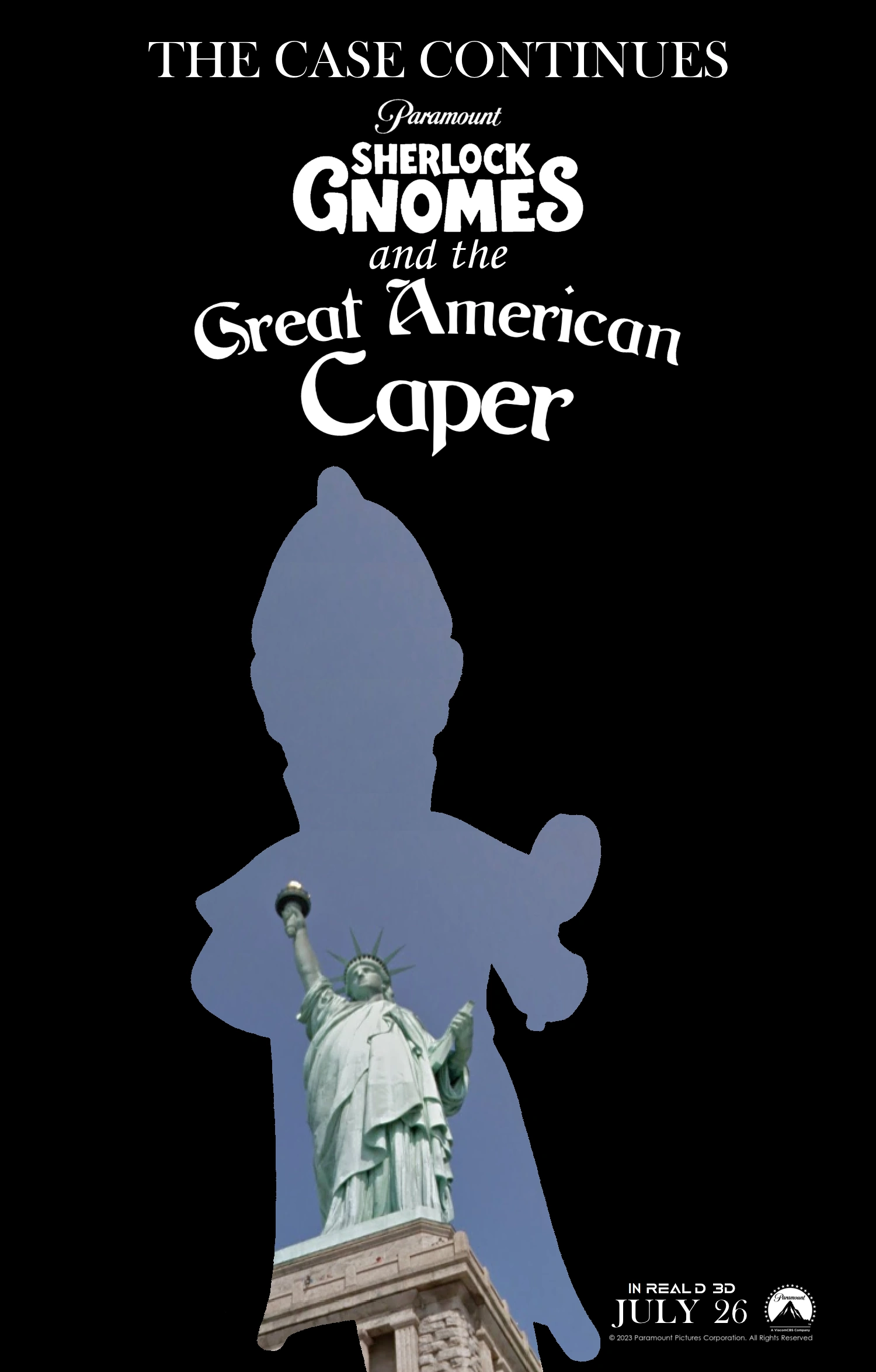 Sherlock Gnomes and the Great American Caper is a 2023 American 3D computer-animated adventure mystery comedy film produced by Paramount Animation and distributed by Paramount Pictures. It is a direct sequel to the 2018 film Sherlock Gnomes, as well as the third installment to the "Gnome" franchise. The film is directed by Kelly Asbury (who directed Gnomeo & Juliet) and John Stevenson. The film features Johnny Depp and Chiwetel Ejiofor reprising their roles from Sherlock Gnomes, with Alfred Molina, Tiffany Haddish, Zachary Levi, and Alan Tudyk as new characters in the cast.
